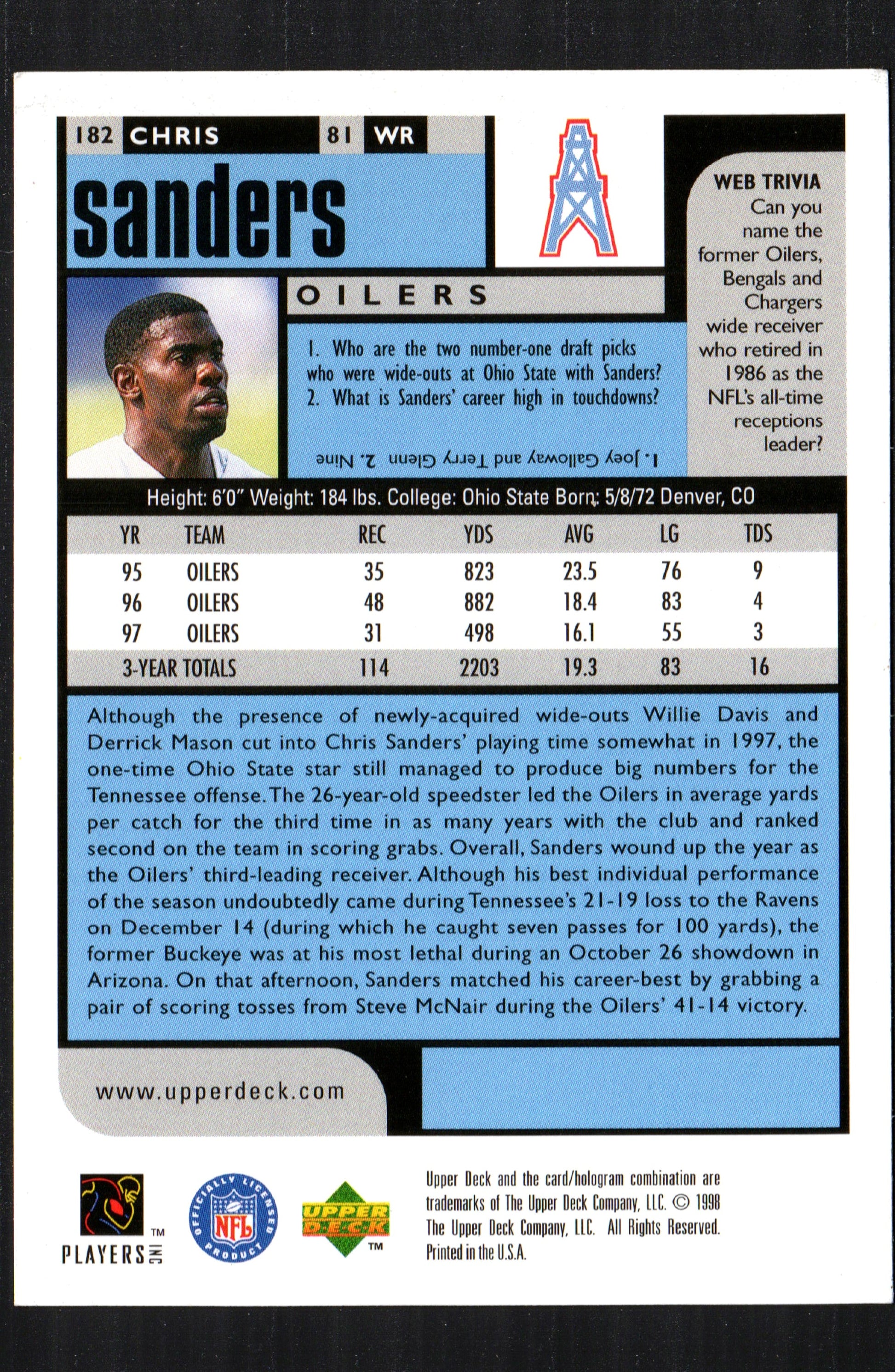 Chris Sanders Tennessee Oilers #182 - 1998 Upper Deck UD Choice