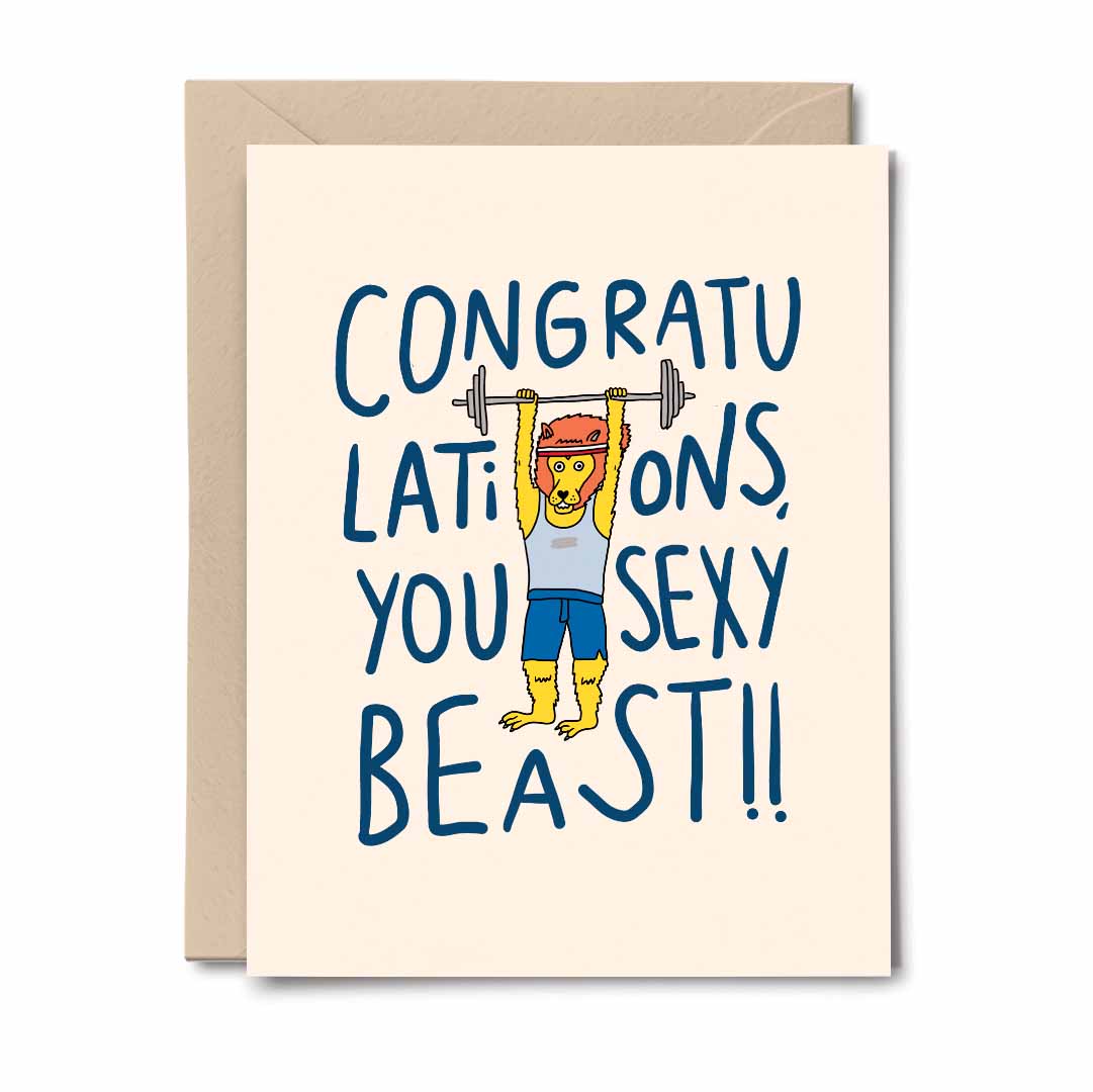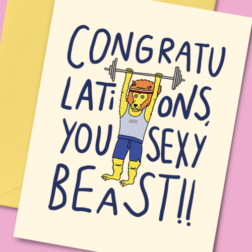 The front of the card has an original illustration by Erwin Ong of a lion lifting a barbell. The card also says "Congratulations, you sexy beast."