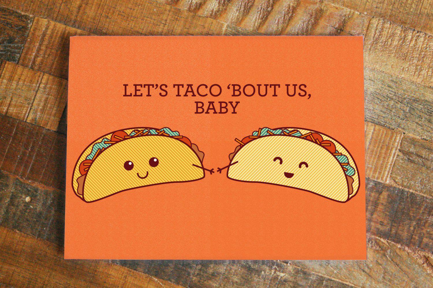 Let's Taco 'Bout Us, Baby! This funny taco pun art card is a high quality print of my original vector art drawing. Perfect as an anniversary card or special occasion or just to show someone you care.